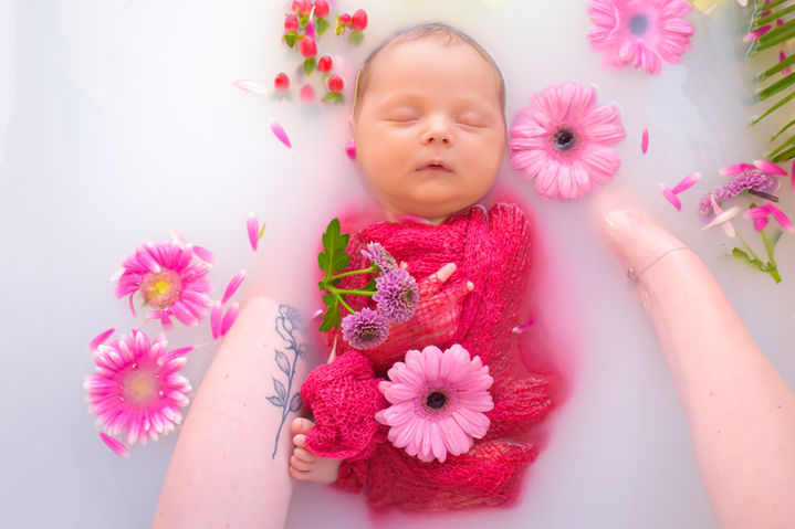 Cette séance met en valeur la pureté et la délicatesse des premiers jours de vie. Bébé est installé dans un petit bain tiède, rempli d’eau et d’un voile de lait, accompagné de fleurs fraîches, feuillages ou éléments naturels soigneusement choisis. Le rendu est à la fois artistique, tendre et apaisant.